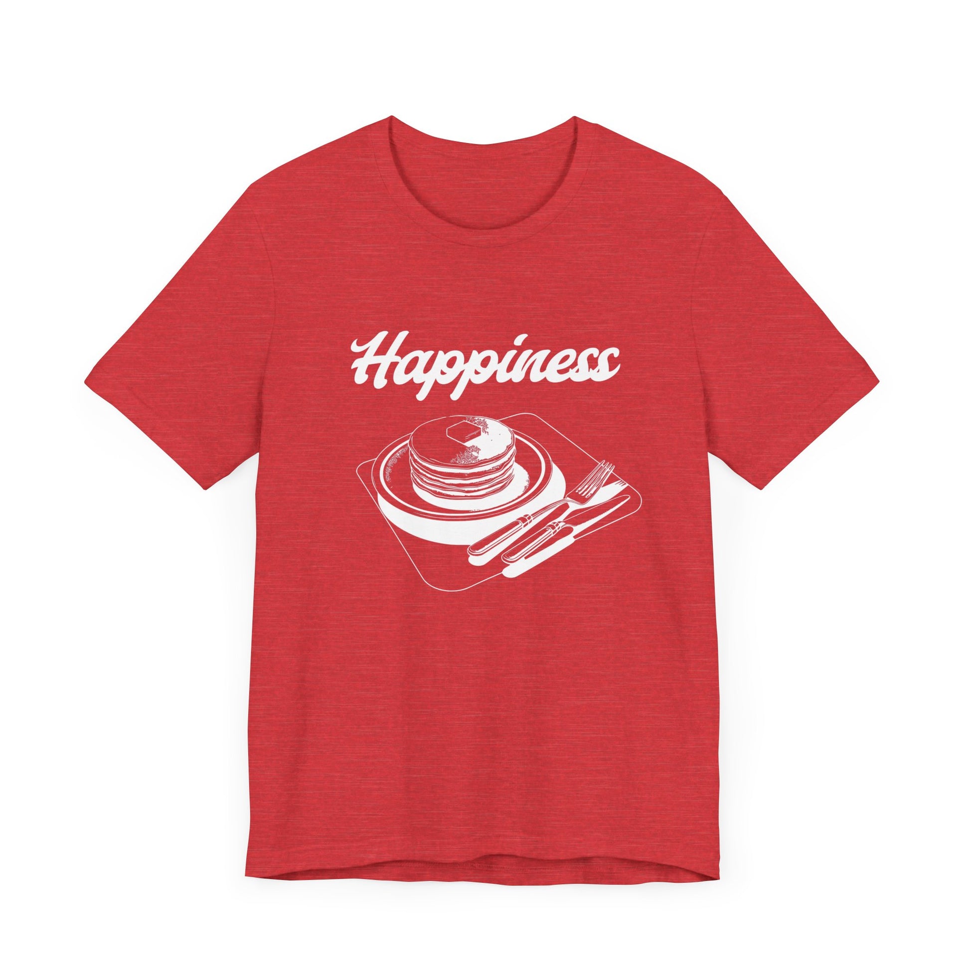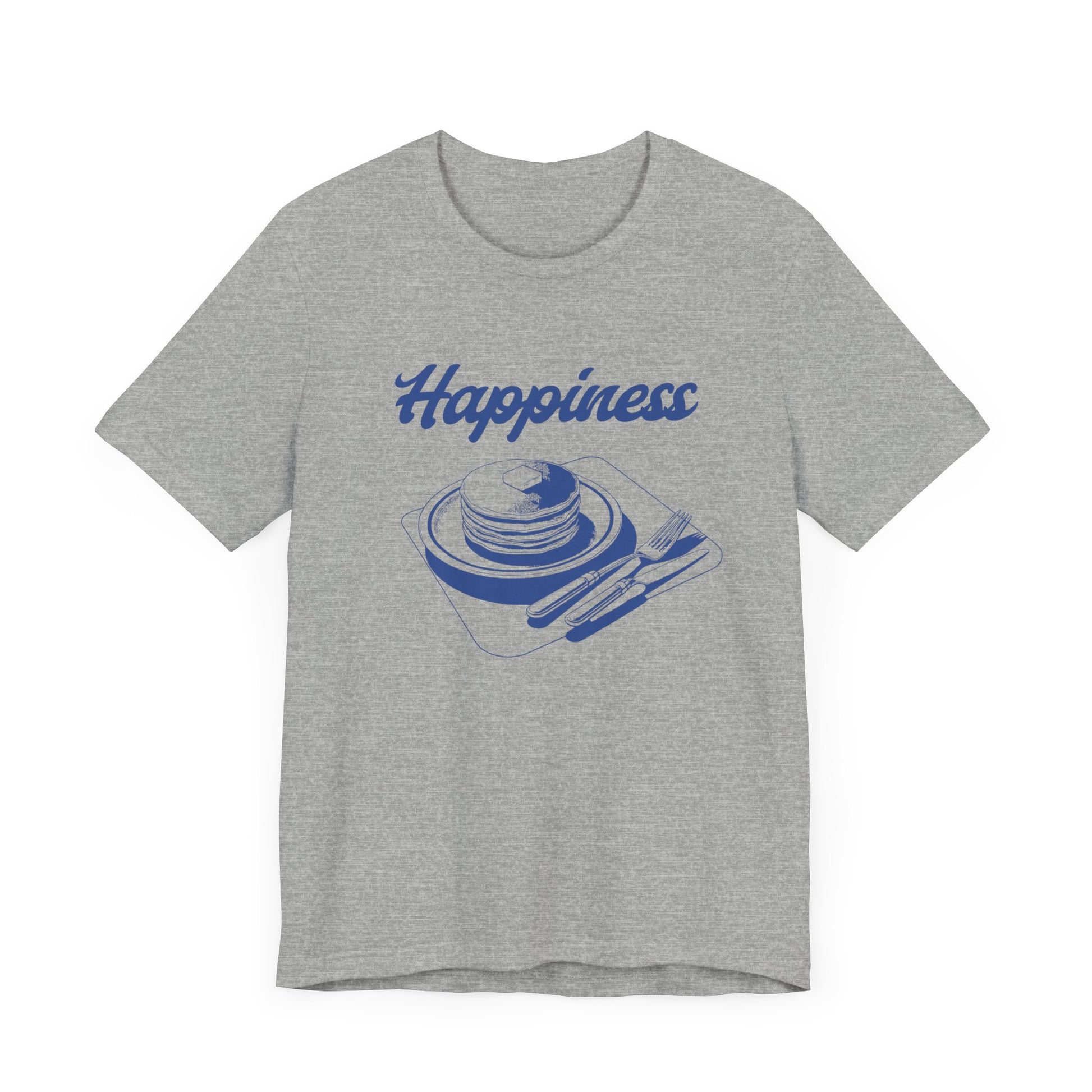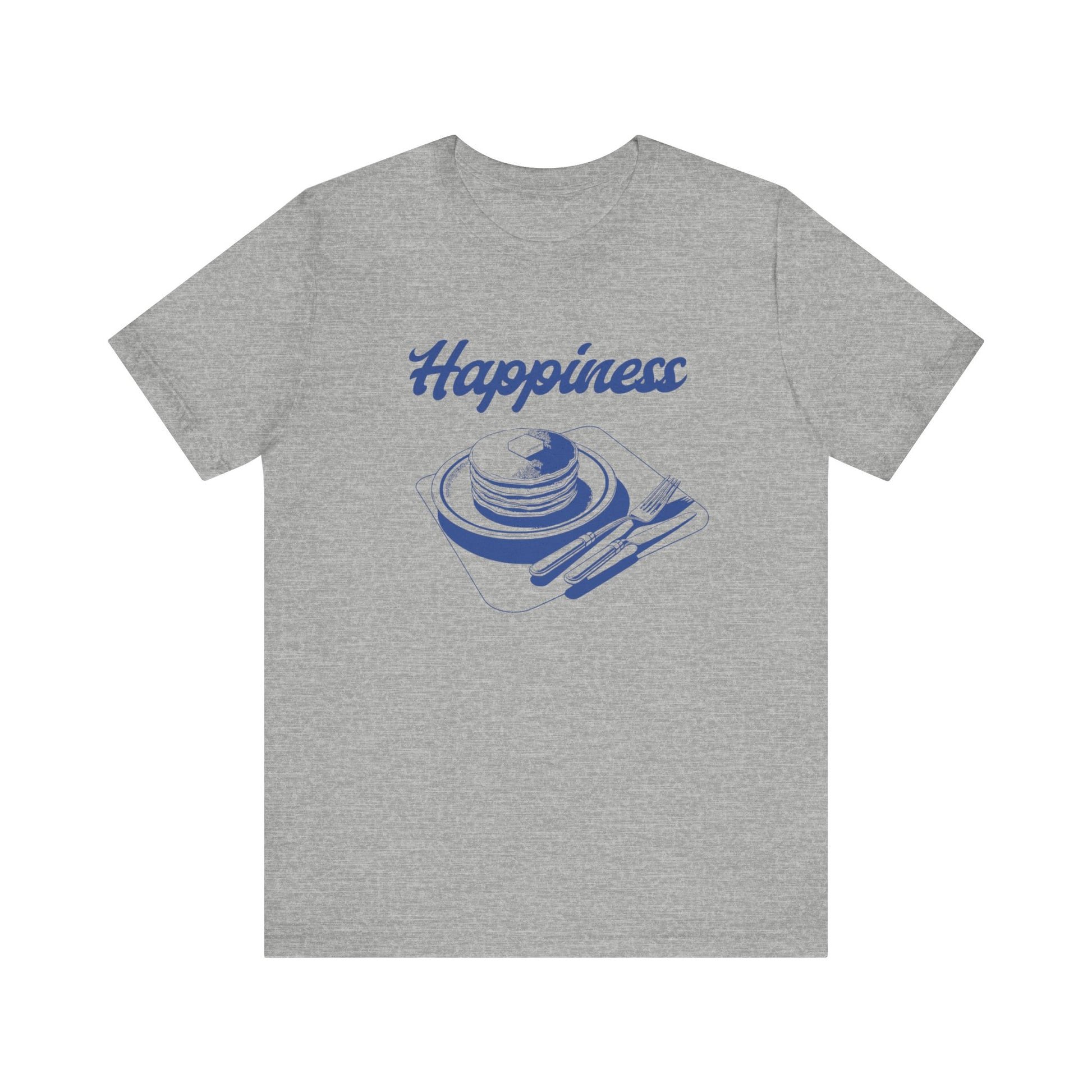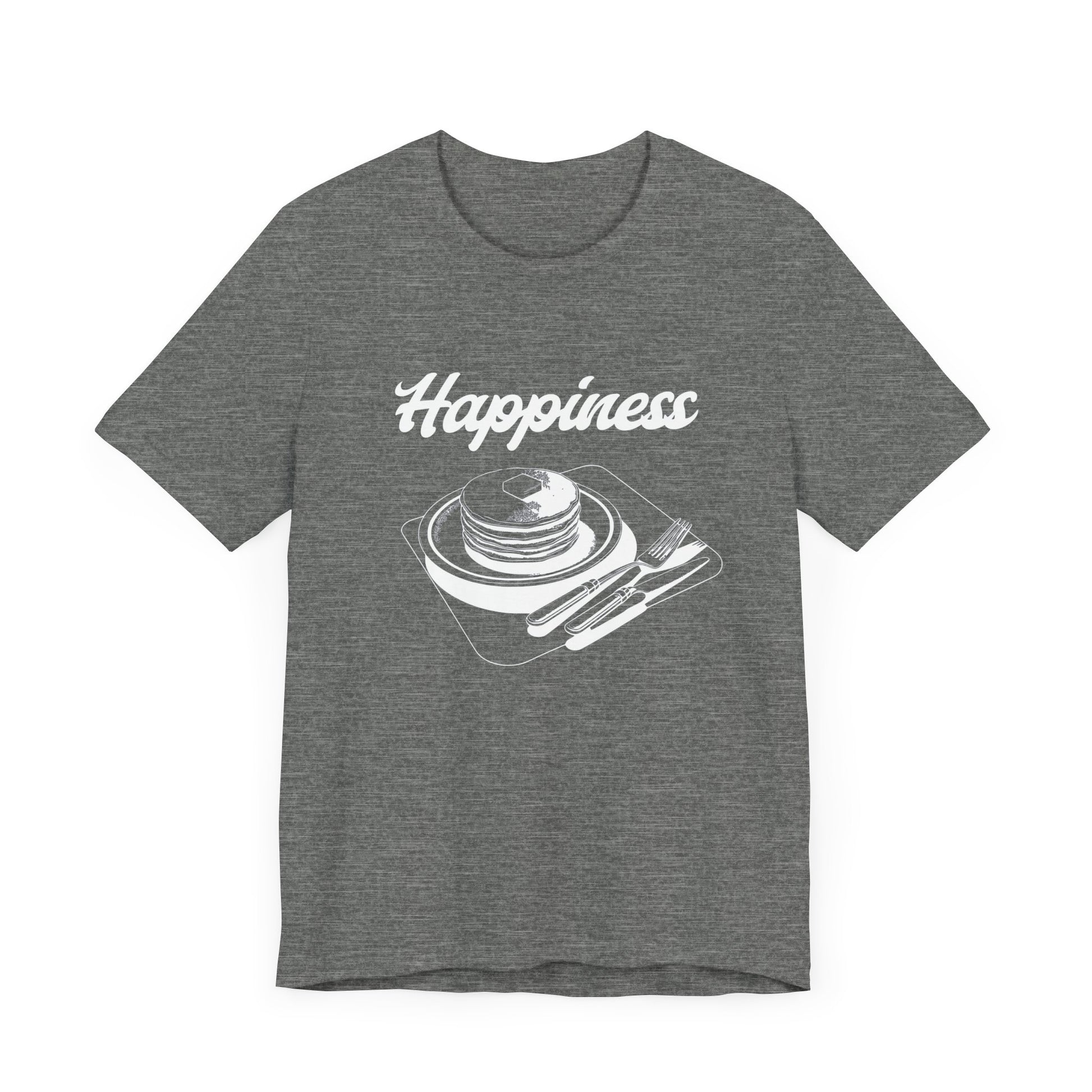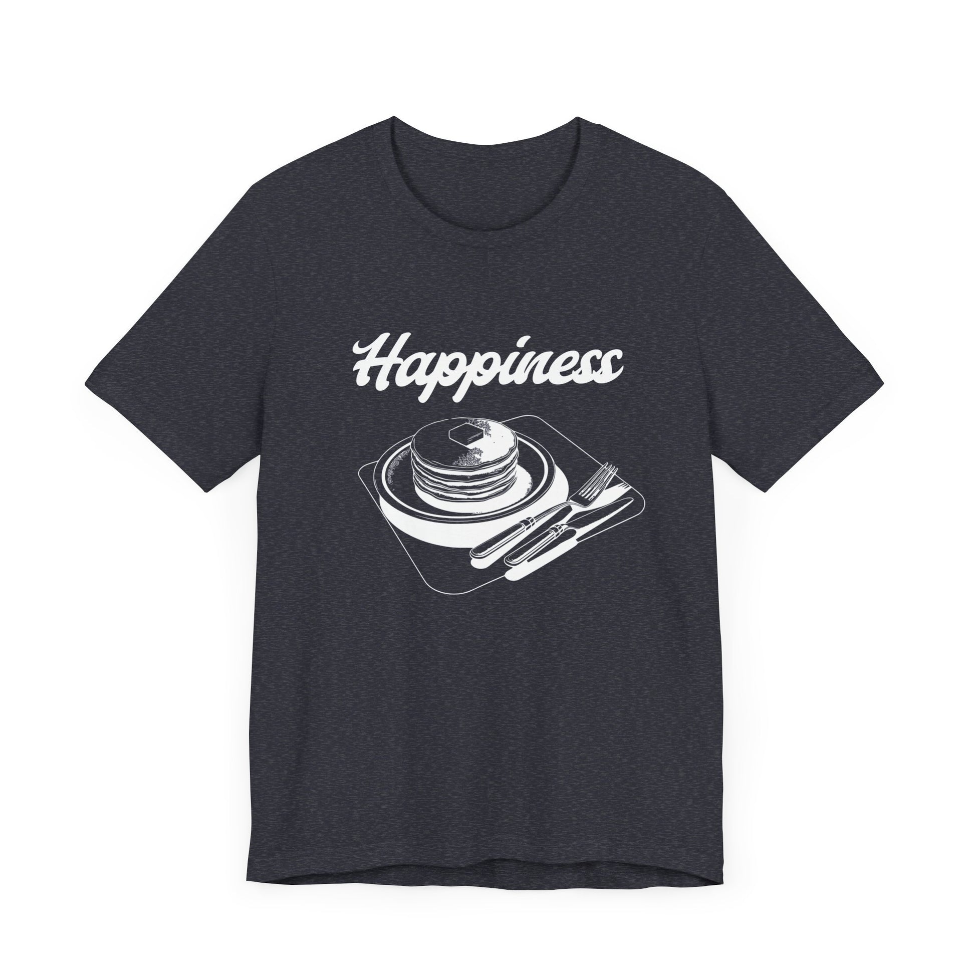 A unisex jersey short sleeve tee featuring the fun design 'Happines is pancakes'. This shirt is perfect for anyone who loves pancakes and wants to add a touch of happiness to their wardrobe. It is ideal for casual wear and would make a great gift for food lovers or anyone who enjoys a whimsical design. Perfect for National Pancake Day or simply to bring a smile to someone's face.